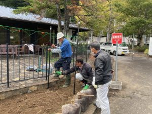 男性参加者に残っていただき、杭を打ったり、ネットを留めたりの作業をお願いしました。