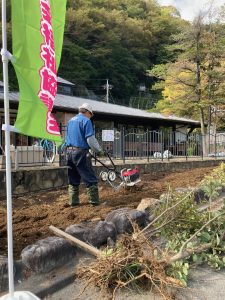 草取りを終えてすっきりした花壇に、耕運機でたい肥を混ぜ込みます。
